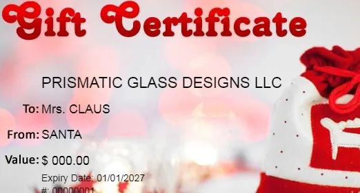 Treat your loved ones to the beauty of stained glass art with Prismatic Glass Designs's gift cards. Available in different amounts, they are perfect for any occasion and can be used to purchase any of our products or apply to our workshops. Please call/text/email us for details, today!